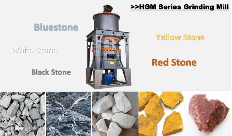 HGM series grinding mill can process a variety of stones with Mohs hardness below 6, such as limestone, dolomite, barite, gypsum, etc. Of course, it also includes bluestone, white stone, black stone, red stone, and yellow stone.